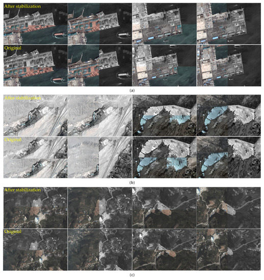 According to the video stabilization method introduced in Section 2, the stabilization experiments were conducted on the satellite video image data of the three land cover type conditions in Section 3.1 as follows: