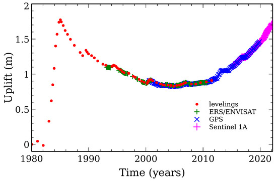 Ground level changes at Rione Terra (R in Figure 1a)—i.e., in the area of maximum vertical displacement—from 1980 to 2022. Red dots, levelling data [15]. Green and magenta pluses, approximate median vertical displacement (Section 2.1) inside a 200 m radius circular area from ERS/ENVISAT and Sentinel-1A images, respectively. Blue crosses, GPS vertical displacement [11].