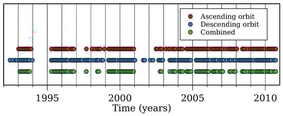 The LOS time series include 138 ascending-orbit images from January 1993 to September 2010 and 155 descending-orbit images from June 1992 to September 2010 (Figure 3). The incidence angle (i.e., the angle between the LOS direction and the vertical) in the study area ranges from 21.6° (westernmost border) to 24.9° (easternmost border) for the ascending orbit and 22.8° (westernmost border) to 19.5° (easternmost border) for the descending orbit. The azimuthal angle (i.e., the angle between the satellite flight direction and north, positive clockwise) is about −12° for the ascending orbit and 192° for the descending orbit. The temporal interferometric coherence of the time series is larger than 0.55 for the ascending orbit and 0.5 for the descending orbit. The accuracy is approximately ±0.5 cm [57]. LOS displacement data are irregularly located, with spacing of approximately 50 to 80 m in covered areas. To decrease the amount of data and noise, we estimated the time series of LOS displacements on a regular (150 m × 150 m) grid by computing a median value for every non-empty block in the grid.