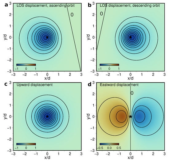 Because of the satellite’s polar orbit, the cosine of the angle between the LOS direction and north is small. The contribution of the northward ground displacement to the LOS displacement is often neglected, enabling us to estimate approximate upward and eastward displacements from ascending-orbit and descending-orbit SAR data. As an example, Figure 4a–d show synthetic ground displacements (ascending-orbit LOS, descending-orbit LOS, and upward and eastward components, respectively) from a very small (point) pressurised spherical cavity embedded in a homogeneous elastic half-space (Mogi source, [58]). We computed LOS displacements assuming that the incidence and azimuthal angles are 23.9° and −12° for the ascending orbit and 20.5° and 192° for the descending orbit. Figure 4e,f show approximate upward and eastward displacements estimated from the synthetic LOS displacements. The approximate eastward displacements (Figure 4f) were found to be practically indistinguishable from the exact ones (Figure 4d); the approximate upward displacements (Figure 4e) are very similar to the exact ones (Figure 4c), although the contour lines are shifted southward.