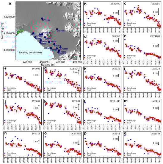Comparison of levelling data [34] and ERS/ENVISAT approximate upward displacements. First, we referenced DInSAR LOS displacements to their median value within a circular area, 250 m in radius, centred on the NA001 reference levelling benchmark (green dot in (a)). Then, we obtained the time series of the DInSAR approximate upward displacements by combining LOS displacements as if northward ground displacement did not contribute and computing the median values within circular areas, 250 m in radius, centred on the levelling benchmarks. (a) Blue dots and labels, levelling benchmarks whose altitude time series are plotted with respect to NA001 in [34]. (b–q) Blue dots, levelling data; red dots, DInSAR approximate upward displacements. Levelling data errors are lower than mm, where L is the length in kilometres of each levelling section. The vertical bar corresponds to 1 cm vertical displacement.