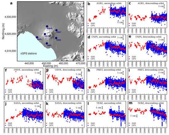 Comparison of cGPS [11] and ERS/ENVISAT DInSAR displacements. First, we referenced DInSAR displacements to the median value within a circular area, 500 m in radius, centred on the LICO GPS station (L in Figure 1); LICO is far from Campi Flegrei and Vesuvio and has a small almost-constant velocity with respect to six stations located outside the Neapolitan volcanic area, whose velocities are expected to reflect the regional tectonic motion [11]. Then, we added the LICO GPS linear trends—0.05 cm/year and −0.12 cm/year along the ascending- and descending-orbit LOS directions, respectively—to each DInSAR displacement time series, obtained by computing the median values within circular areas, 500 m in radius, centred on the cGPS stations. (a) Blue dots and labels, cGPS Vesuvio stations that are located in areas covered by SAR data and started operating before 2006 [11]. (b–m) Blue dots, daily cGPS displacements projected along DInSAR LOS directions; red dots, DInSAR displacements. The vertical bar corresponds to 1 cm displacement.