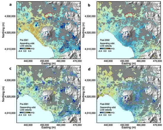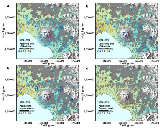 Figure 7a,b show maps of the LOS (ascending and descending orbits) and approximate upward and eastward mean displacement rates (velocities) in the Vesuvian area for the period 1993–2010. The LOS velocity maps are similar to Figure 3 in [37], apart from a uniform velocity translation due to a different reference area. As already pointed out by others, the most evident features are the occurrence of subsidence at the summit and S-SW flank of the volcanic edifice [37], subsidence spots along a discontinuous “girdle” about 10 km from the Vesuvio summit, and the occurrence of uplift W-NW and S-SE of the volcanic edifice [35,36,37].