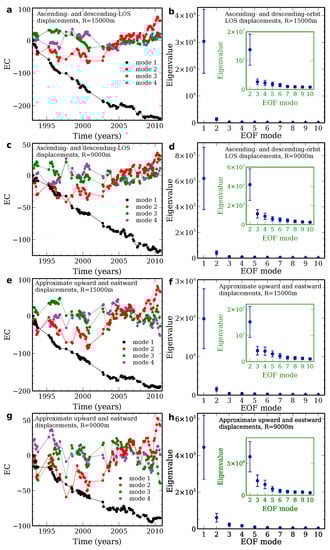 Expansion Coefficients (ECs) and eigenvalues for the first EOF modes. The EOF analysis of the 1992–2010 displacement time series was carried out inside a circular area of radius R centred on the magenta star in Figure 7. The error bars in the eigenvalue plots give uncertainties. (a,b) Joint EOF analysis of ascending and descending LOS displacements, R = 15,000 m. (c,d) Joint EOF analysis of ascending and descending LOS displacements, R = 9000 m. (e,f) Joint EOF analysis of approximate upward and eastward displacements, R = 15,000 m. (g,h) Joint EOF analysis of approximate upward and eastward displacements, R = 9000 m. Green-framed insets in (b,d,f,h) zoom out the y-axis to show the lack of significance for modes higher than 2.