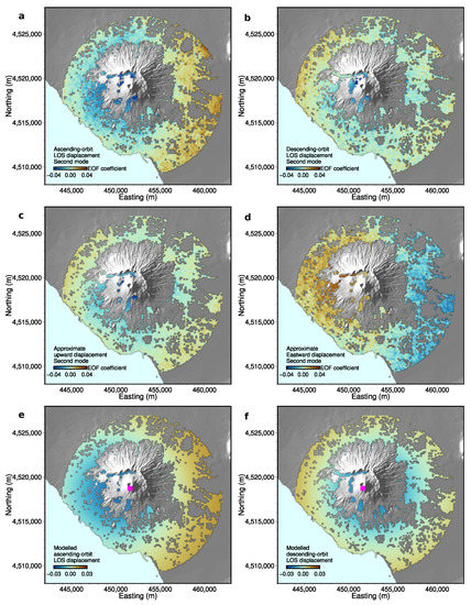 Maps of the second mode EOF coefficients. The EOF analysis of the 1992–2010 displacement time series was carried out inside a circular area, 9000 m in radius, centred on the magenta star in Figure 7, in order to exclude the “girdle” of discontinuous strong subsidence approximately 10 km from the Vesuvio summit. (a) EOF coefficients for the ascending-orbit LOS displacements, obtained from the joint EOF analysis of ascending and descending LOS displacements; (b) EOF coefficients for the descending-orbit LOS displacements, obtained from the joint EOF analysis of ascending and descending LOS displacements; (c) EOF coefficients for the approximate upward displacements, obtained from the joint EOF analysis of approximate upward and eastward LOS displacements; (d) EOF coefficients for the approximate eastward displacements, obtained from the joint EOF analysis of approximate upward and eastward LOS displacements. (e,f) Computed ascending- and descending-orbit LOS displacements caused by the depressurisation of a very small (point) spheroidal cavity embedded in a homogeneous elastic half-space whose Poisson’s ratio is 0.25; source depth is 7300 m; polar-to-equatorial radius is 1.1; the magenta square gives the source position.