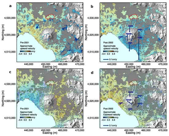 Post-2002 velocity maps (Figure 11b,d and Figure 12b,d) show very different features, which are easily interpretable when looking at the approximate upward and eastward velocity components. After 2002, the strong subsidence spots are less evident than before 2001, and the whole Vesuvian area was clearly subsiding (Figure 12b); the two side lobes in Figure 12d are consistent with the deflation of a pressurised cavity. Post-2002, upward and horizontal cGPS velocities are also consistent with the deflation of a pressurised cavity (Figure 12b,d).