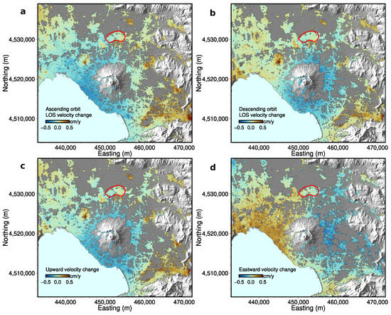 Difference between post-2002 and pre-2001 mean velocities. Each velocity component is referenced to its median value inside the area enclosed by the red polygon. (a) Ascending orbit, LOS direction. (b) Descending orbit, LOS direction. (c) Approximate upward displacement. (d) Approximate eastward displacement.