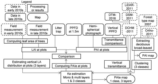 We use abbreviations of technical terms in Table 1. We note empirically estimated extinction coefficients as Ke. Figure 1 shows a flowchart of the field measurements and analysis procedure. We compared LAI measurement or PAI estimation results among the different methods to examine their similarity and reliability, using the measurements of the late 2010s, except the vertical transmittance. Measurements from early 2010s and LiDAR-2011 were compared to understand LiDAR-2011′s ability to detect canopy structure and to estimate Ke.