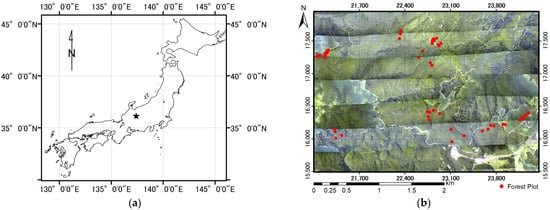 Study site. (a) Location in Japan; (b) aerial photo of the study area in 2011. Red dots show locations of deciduous broad-leaved forest plots.