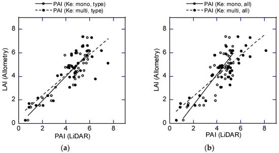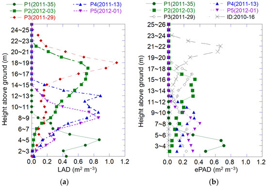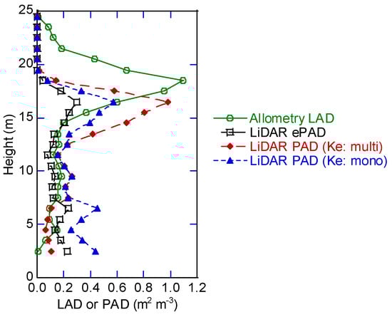 Vertical canopy structure affects the physical environment under canopies []. Therefore, mapping the vertical PAD structure in large forests is important to better understand the function of canopies, and it should be a topic of future research. It is important to estimate Ke using airborne LiDAR data and known vertical LAD or PAD distributions or to set Ke for distinct vertical layers by measuring leaf angle distribution accurately to estimate PAI and vertical PAD using the Beer–Lambert law.
