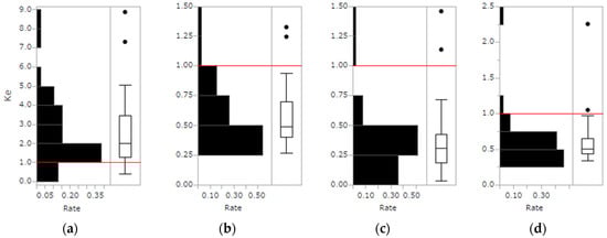 Utsugi [] showed that the constants, β and ε, of the Weibull distribution equation are positively correlated with canopy length (CL) by tree height (CL/H) (p < 0.01) using felled stem samples of 26 trees (Japanese white birch, Betula platyphylla var. japonica; Mongolian oak; Castor aralia, Kalopanax pictus) logged in a 91-year-old deciduous broad-leaved forest near Sapporo, Hokkaido, Japan, as shown in Equations (6)–(8).