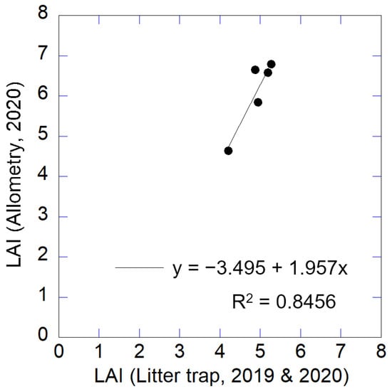 Allometric equations for computing LAT were created using data of 65 trees that were logged by Komiyama et al. [] for an analysis of relative growth among tree parts of deciduous broad-leaved trees in Hida district, Gifu between 1990 and 1993. Trees were logged in Shoukawa village, Gifu and the Kuraiyama Experimental Forest of Gifu University [] about 40 km west and 27 km southwest of our study site, respectively. The major species, Mongolian oak, painted maple (Acer mono), Japanese lime tree (Tilia japonica), Japanese red birch (Betula maximowicziana), and Kousa dogwood (Cornus controversa var. controversa), and ages of the trees in these areas were similar to those in our study site. Allometric equations for LAT estimation were created with Equation (3), which employs the least-squares method using the square of DBH (cm) multiplied by H (m).