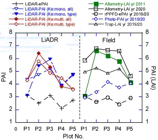 Classifying forest types based on 3D laser pulse distribution [,] and developing methods for monitoring the structure are important for elucidating forest ecosystem functions [,,,,]. Parameters such as leaf area index (LAI) and vertical leaf area density (LAD) distribution are used to determine the 3D structure of forests [,,]. Although passive optical sensors are used to estimate LAI or PAI [,], the sensors cannot observe reflected solar radiation from the bottom of the dense canopy. Thus, spectral signals become saturated in high LAI values (LAI ≥ 4) in forest ecosystems []. On the other hand, a part of light detection and ranging (LiDAR) pulses pass through canopies and return to the scanner, and provide structural information. Therefore, LiDAR data will achieve accurate PAI and PAD estimations through analyzing three dimensional structures.