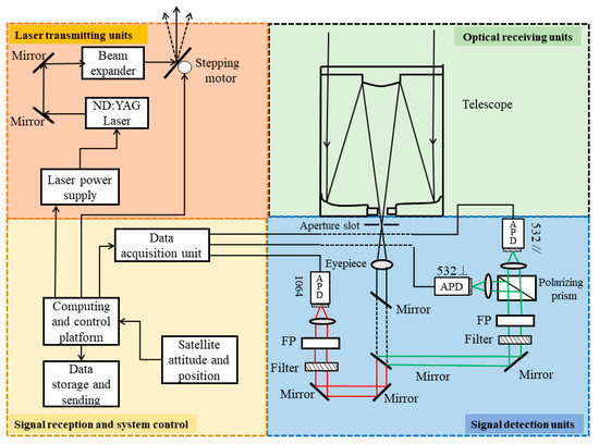 The schematic diagram of CSLHRL is shown in Figure 3. The main units of the system include the laser transmitting unit, optical receiving unit, signal reception and system control unit, and signal detection unit. In the laser transmitting unit, two lasers were used to emit 532 nm and 1064 nm wavelengths, respectively, which are reflected into the atmosphere through the self-regulating mirror after beam expansion. In the optical receiving unit, a Cassegreen telescope with a 400 mm aperture and 2000 mm focal length was used. The receiving field of view was 0.2 mrad through a 0.3 mm aperture without considering the external load. In the signal detection unit, the background suppression of the 532 nm and 1064 nm channels is performed by using a Fabry–Perot Interferometer (F-P). The detection unit and the acquisition unit adopt the avalanche photo diode (apd) based on the weak signal detection technology of photon counting to realize the highly sensitive detection of atmospheric backwave optical signals in a large dynamic range.
