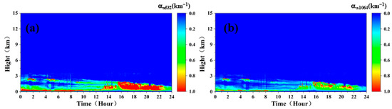 Aerosol extinction coefficient at 532 nm (a) and 1064 nm (b) wavelengths.