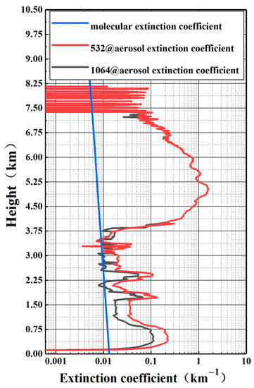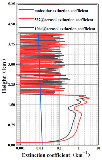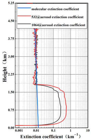 To show the size of the aerosol extinction coefficient more clearly, we chose the extinction coefficient profile at 16:00 p.m., when the pollution was severe, as shown in Figure 5. It can be seen from the figure that the extinction coefficient of the aerosol at 532 nm at that time was near 1 km−1, and even exceeded 3 km−1 at 1.7 km. Due to the large aerosol concentration near the ground, the SNR above 1.8 km was poor, and effective data cannot be obtained.