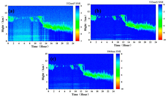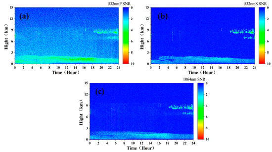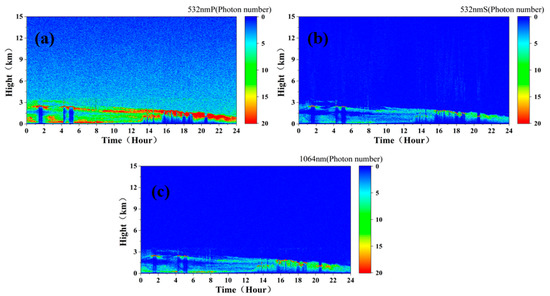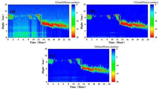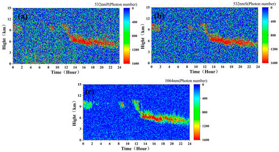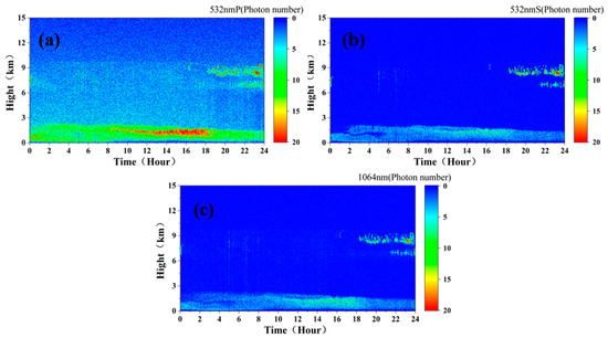 Due to the influence of strong solar background radiation, the vertical resolution of 15 m and the cumulative pulse number of 1000 cannot meet the needs of detection. To reduce the impact of background radiation, it was found that, when the vertical resolution was 120 m and the cumulative pulse number was 10,000, the detection needs can be initially met. Figure 10a–c show the simulated measured signals at the 532 nm P, 532 nm S, and 1064 nm channels, respectively, of the spaceborne lidar (assuming that the sky background radiation intensity is a constant Pb532 = 0.2 W·m−2·sr−1·nm−1, and Pb1064 = 0.08 W·m−2·sr−1·nm−1, which do not change with time).