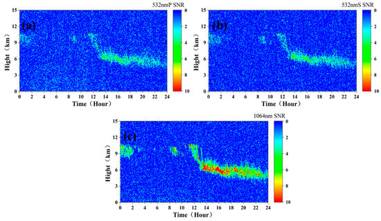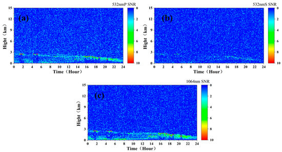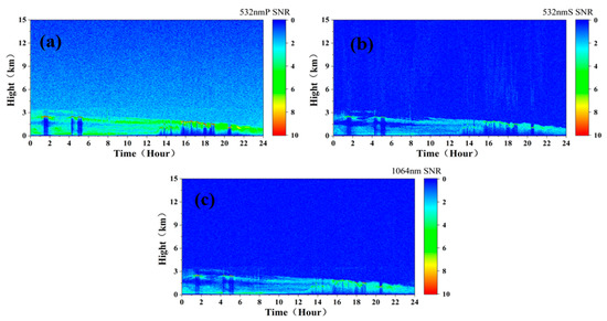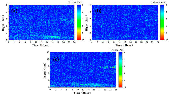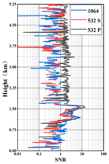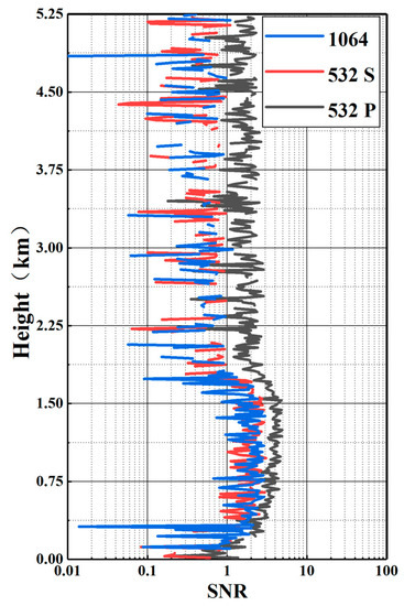 Figure 8 shows the SNR profile at 16:00 p.m. It can be found that the simulated spaceborne lidar signal cannot be received due to the high-concentration pollution aerosol at 0.8–1.6 km, resulting in a poor SNR below 0.8 km. At the altitude of 0.8 km−1.6 km, the aerosol concentration was high, and the SNR of 532 nm P was more than 3, and some altitudes even exceeded 10. In addition, due to the influence of energy and wavelength, the SNRs of the 532 nm and 1064 nm signals were smaller than the SNR of 532 nm P signals.