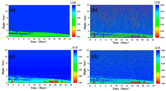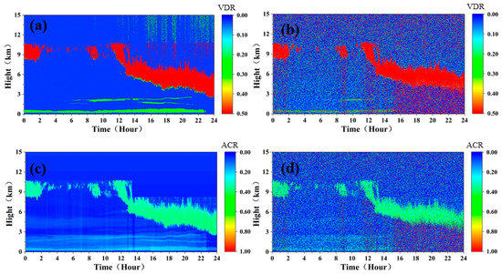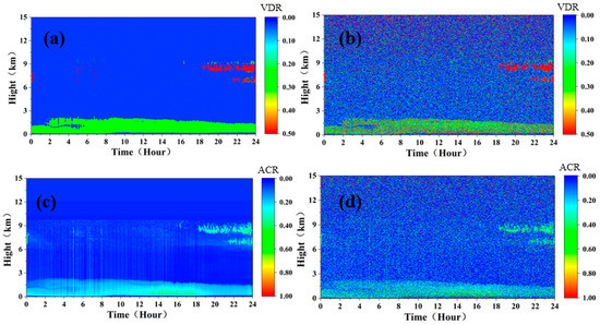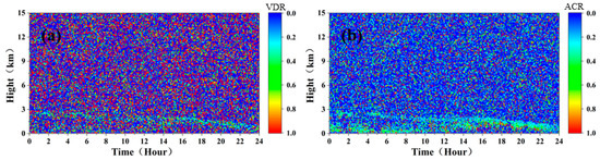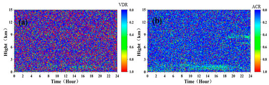 The volume depolarization ratio (VDR) of aerosol particles can be calculated by Equation (13) [36].