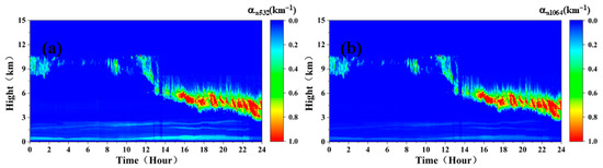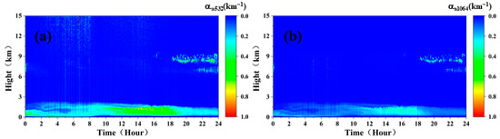 Figure 22 shows the spatial and temporal distribution characteristics of the atmospheric aerosol and cloud particle optical parameters on a clear and cloudy day in Hefei, China, on 28 May 2022. Figure 22a shows the aerosol extinction coefficient measured by the Mie scattering lidar at 532 nm, and Figure 22b shows the aerosol extinction coefficient of 1064 nm simulated and retrieved with the 532 nm signal. As can be seen from the figure, the ground-based lidar signal was strong, extending to an altitude of 15 km, due to the low concentration of pollution aerosol particles near the ground on that day. At the same time, high clouds existed at a height of 8~10 km from 00:00 a.m. to 12:00 p.m. and gradually decreased to a height of 2~6 km after 12:00 p.m.