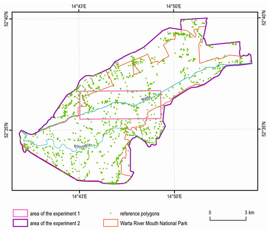 The study was conducted in the Warta River Mouth National Park, located in western Poland, in the mesoregions of the Gorzow Basin and Freienwalde Basin—a fragment of the Toruń-Eberswalde Ice Marginal Valley [26]. The survey covered the entire park and part of its buffer zone—a total of 110.8 km2. Experiment 1 was carried out on a selected area of 15.6 km2, representative of the park’s vegetation, while Experiment 2 was carried out on the entire analysed area (Figure 1).