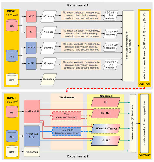 Research scheme of experiments 1 and 2; HS—hyperspectral data, ALS—Airborne Laser Scanning data, MNF—Minimum Noise Fraction, SI—spectral indices, TOPO—topographic indices, ALSF—ALS features, REF—reference polygons, TI—textural information, TIHS—influential TI features based on HS data, TIHS+ALS—influential TI features based on HS and ALS data, F1—accuracy calculated for classes in classification process.