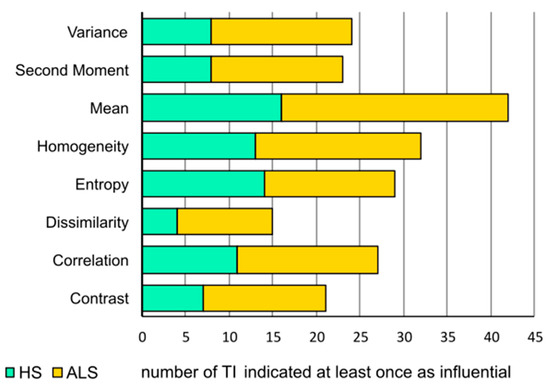 The number of influential TI acquired for HS and ALS. The figure shows how many times each type of TI was indicated at least once as influential (the PI value was above 0) divided into HS and ALS data.