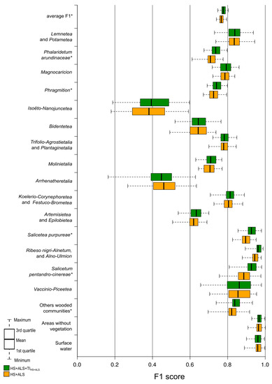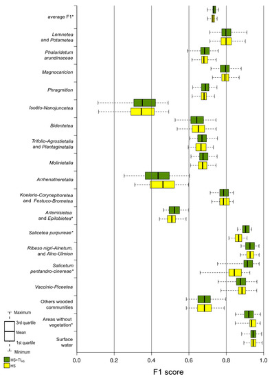 For the HS dataset, the average accuracy of F1 for a single class varied from 0.346 (Isoëto-Nanojuncetea), which is a very low value and the class was not properly classified, to 0.928 (Ribeso nigri-Alnetum and Alno-Ulmion), which indicate correct identification. For seven classes, including five communities classes (Lemnetea and Potametea, Salicetea purpureae, Ribeso nigri-Alnetum and Alno-Ulmion, Salicetum pentandro-cinereae, Vaccinio-Piceetea), the F1 accuracy was above 0.800, which indicates the correct classification of these units. An average F1 value was below 0.500 for two classes only (Isoëto-Nanojuncetea, Arrhenatheretalia). Similar conclusions can be drawn from the results calculated based on the HS + TIHS scenario. For the same two classes (Isoëto-Nanojuncetea, Arrhenatheretalia), the accuracies were below 0.500; and for four classes, the F1 were above 0.800 (Salicetea purpureae, Ribeso nigri-Alnetum and Alno-Ulmion, Salicetum pentandro-cinereae, Vaccinio-Piceetea).