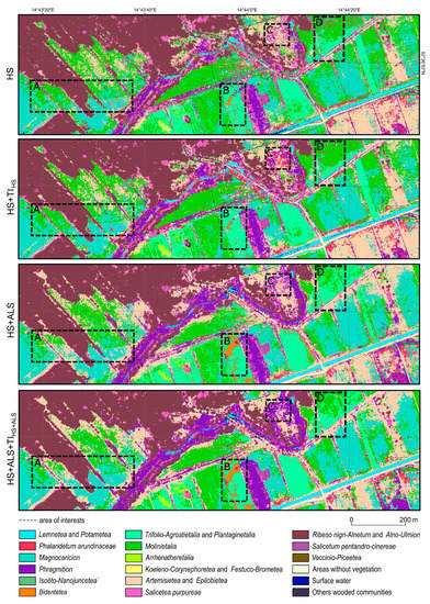 To compare the results for single classes, four areas of interest were analysed A, B, C, and D (see Figure 9), and the differences between scenarios were observed. For area A in the HS scenario, Phalaridetum arundinaceae patches were weakly isolated. Adding TI to both scenarios (HS and HS + ALS) resulted in an improvement in the course of the boundary between patches: for HS + TIHS, the improvement was noted for Phalaridetum arundinaceae, whereas for HS + ALS + TIHS+ALS, the differences were also visible for the Molinietalia, Trifolio-Agrostietalia and Plantaginetalia, and Artemisietea and Epilobietea classes.