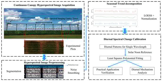 Remote sensing coupled with hyperspectral technology has become increasingly popular to investigate plant traits, showcasing its advantages in studying plant growth, health, and productivity. The quality of the collected hyperspectral images is crucial for subsequent data analysis and plant phenotyping studies. However, diurnal variations in spectral characteristics introduce more data variance in canopy reflectance spectra, raising the cost of subsequent analyses and compromising the performance of trait estimation models. In this study, a fixed gantry platform in a cornfield was used to capture visible and near-infrared (VNIR) hyperspectral images of corn canopies at consecutive time intervals. By applying reference board calibration and locally weighted scatterplot smoothing to minimize the effects of ambient light and daily growth, diurnal spectral changes across all involved VNIR wavelengths were investigated. Several distinct diurnal patterns were observed to have close connections with the plants’ physiological effects. Diurnal calibration models were established at every wavelength by employing the least squares polynomial algorithm, with the highest coefficient of determination reaching 0.84. Moreover, by employing diurnal calibration in canopy spectra processing, the reduction in spectral variance brought about by varying imaging time was evidently exhibited. This study not only reveals the diurnal spectral variation pattern at VNIR bands but also offers a reliable, straightforward, and low-cost approach to improve the quality of remote sensing data and reduce the inherent variance brought about via the different imaging times ensuring that comparable spectral analysis can be performed under relatively fair conditions.