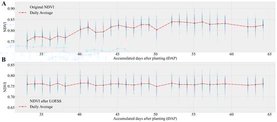 The comparison curves result from the original NDVI value at different DAP and the NDVI value after trend and seasonal decomposition based on LOESS. ((A): the original NDVI value had relative severe fluctuation with the changing of time; (B): the NDVI value after LOESS kept a relative stable fluctuation at different DAP).