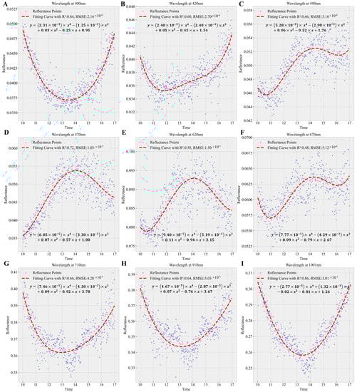 Several diurnal calibration curves derived from polynomial models at various characteristic wavelengths ((A–I): 400 nm, 420 nm, 440 nm, 470 nm, 620 nm, 670 nm, 710 nm, 910 nm, 1001 nm).