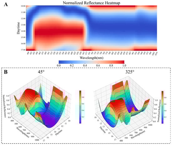 The normalized reflectance heatmaps of diurnal changing pattern under varying times of day and wavelengths ((A): the view of 2D heatmap; (B): the view of 3D surface maps at both 45° and 325° view angles).