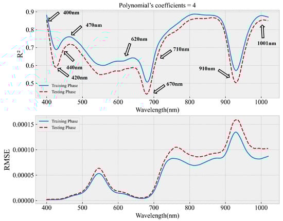 To further examine the whole picture of these calibration models, considering the daily time as the independent variable, the pattern of diurnal changes at specific wavelengths emerged as the primary factor in constructing calibration models. The complexity of diurnal variation magnitude significantly impacted the models established, emphasizing the importance of understanding these changes to create accurate and reliable models. Figure 5 illustrated the training and testing results of diurnal calibration models utilizing a polynomial with a degree of four. It can be observed that the R2 values in the testing phase were slightly lower than those in the training phase, showing no sign of severe overfitting. Additionally, the relatively low values of the RMSE across all available wavelengths presented the high level of prediction accuracy of the established diurnal calibration model. Different responses occurred during the modeling of wavelength–time-related function. For example, the predictive ability of the diurnal calibration model reached a promising level at approximately 400 nm, 470 nm, 800 nm, and 1001 nm with the R2 values above 0.7. There were also some curve valleys representing relatively low regression performance at several wavelengths, including 420 nm, 670 nm, and 910 nm. These R2 curve dips indicate the areas where the model may struggle to accurately capture the underlying patterns. Overall, the majority of diurnal variances within the investigated daily time could be acquired by the established calibration model.