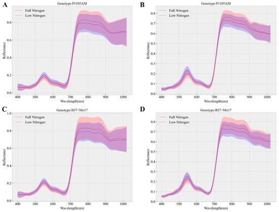 The averaged spectra under full nitrogen and low nitrogen treatment from two corn genotypes’ testing sets. ((A,C): the original spectra; (B,D): the spectra after diurnal calibration to solar noon). The shaded areas indicate the standard deviation range.