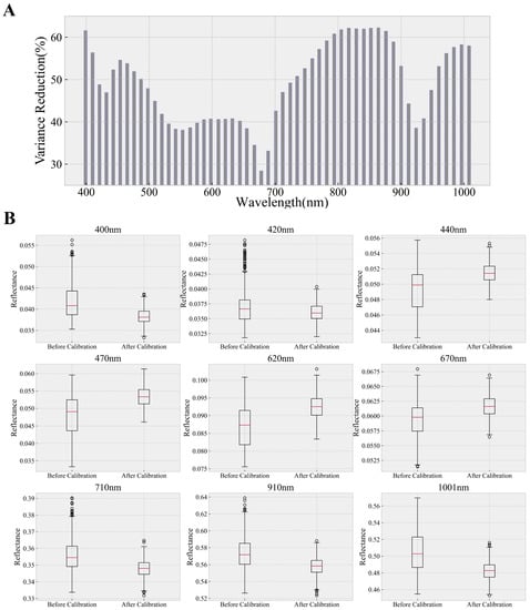 Variance reduction ratio at different wavelengths after diurnal calibration ((A): variance reduction ratio at all available wavelengths; (B): statistical comparison between the before and after diurnal calibration based on reflectance at representative wavelengths).