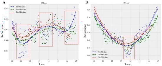 Compared to Ma’s research [19], which concentrated on modeling the diurnal fluctuations in NDVI, this study broadened the calibration scope to encompass the full VNIR spectrum. Throughout this process, more complex diurnal patterns across different wavelengths were uncovered and modeled. By analyzing the results from both Figure 3 and Figure 4, it can be observed that the relatively high predicted R2 values were associated with the stable status of the diurnal spectral pattern. Additionally, the transition phase of diurnal pattern variation, such as at around 420 nm and 670 nm, tended to be associated with lower predicted R2 values. The impact of growth stages and other environmental factors might be relevant in determining the diurnal variations within those spectral ranges [20]. Figure 8A demonstrates that the diurnal patterns at 670 nm exhibited three noticeable differences on various sampling dates, as highlighted by the red boxes. Additionally, it was difficult to identify a consistent pattern of diurnal variation, especially at the time around 16 pm. At 1001 nm, where accurate predictions were achieved, the overall pattern of diurnal spectral variation was easily discernible, with only one area showing slight divergence (see Figure 8B). Although the overall diurnal pattern retained a consistent U-shape, the prediction performance for the diurnal pattern around 930 nm still decreased. In Figure 9, it can be seen that the reflectance at 930 nm was concentrated around the mean, whereas the reflectance at 960 nm and 1001 nm was more dispersed, indicating greater variance in the data and a more pronounced U-shape. All in all, the varying performance could be attributed to the complexity of the data, which was reflected in both the curve tendency and the variance of the data. As the complexity of the diurnal pattern increases in those wavelengths in the transition phase, modeling it becomes increasingly challenging [31].
