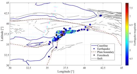 A strong earthquake of Mw = 7.8 magnitude happened on 6 February 2023 at 1:17:34 UT (LT = UT + 3:00) at the geographic location of 37.22°N and 37.02°E and a 10.00 km depth (https://earthquake.usgs.gov/earthquakes/, accessed on 01 May 2023). The mentioned earthquake was a result of the strike-slip transcurrence of three plates, including African, Anatolian, and Arabian, among a vertical fault plane. Figure 1 indicates the geographic location of the registered earthquakes with an M ≥ 4.1 magnitude around the epicenter from 6 to 17 February 2023. The plate boundaries are shown as red dashed lines and the two foreshocks as black diamonds.