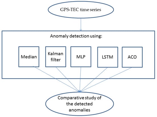 Since the behavior of the time series of ionospheric precursors is strictly nonlinear and complex, the use of machine learning and pattern recognition intelligent methods seems necessary in order to detect unusual patterns. In this study, in addition to the median method, four other algorithms, including Kalman filter, multilayer perceptron (MLP), long short-term memory (LSTM), and ant colony optimization (ACO), have also been implemented to detect pre-seismic anomalies. Figure 2 shows a flowchart of anomaly detection steps with the mentioned methods.