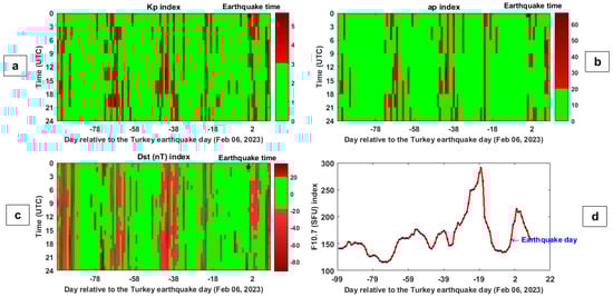 Figure 3a–c represent the geomagnetic indices of Kp, ap, and Dst, respectively, in the time period of 1 November 2022 to 17 February 2023. The values of geomagnetic indices are displayed in quiet conditions with green color and in nonquiet geomagnetic conditions with red color. A black star indicates the earthquake origin time. The horizontal axis shows the days relative to the day of the earthquake. The y-axis represents the universal time. In the period before the day of the earthquake, these indices show relatively quiet geomagnetic activities. However, on the day of the earthquake, the Kp index shows a relatively high value. Figure 3d indicates the time series of solar radio flux (F10.7) in the time period of 1 November 2022 to 17 February 2023. It can be seen that the earthquake happened after a high increase in this solar index about 19 to 26 days before the earthquake. In some previous studies, the possible connection between solar activities and large earthquakes has been discussed, although this hypothesis has not been proven yet [28]. In this study, potentially pre-seismic TEC anomalies are discussed during the quiet solar–geomagnetic conditions (i.e., F10.7 < 180 SFU, |Dst| ≤ 20 nT, ap < 20 nT, and Kp < 3 nT).