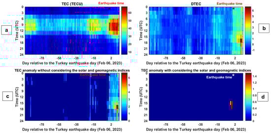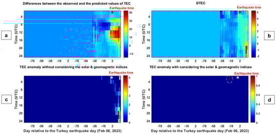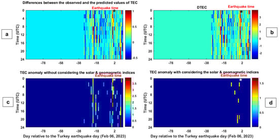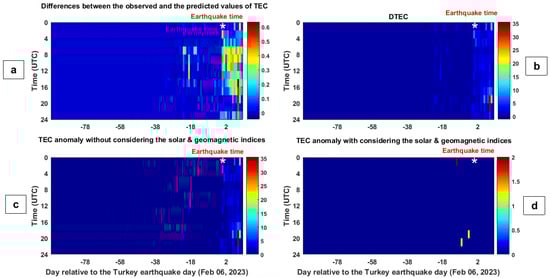 Results of TEC analysis for the Turkey earthquake (6 February 2023) using the median method during the period of 1 November 2022 to 17 February 2023. (a) Variations of TEC, (b) variations of DTEC, (c) observed TEC anomalies regardless the solar–geomagnetic conditions, and (d) observed TEC anomalies by considering quiet solar–geomagnetic conditions. The x-axis represents the days relative to the earthquake day. The y-axis indicates the universal time. An asterisk “*” shows the earthquake origin time.