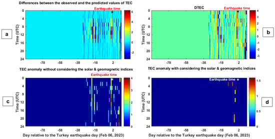 Results of TEC analysis for the Turkey earthquake (6 February 2023) using the LSTM method during the period of 1 November 2022 to 17 February 2023. (a) Variations of TEC, (b) variations of DTEC, (c) observed TEC anomalies regardless the solar–geomagnetic conditions, and (d) observed TEC anomalies by considering quiet solar–geomagnetic conditions.