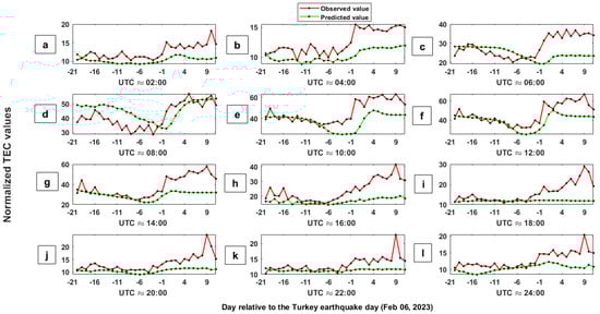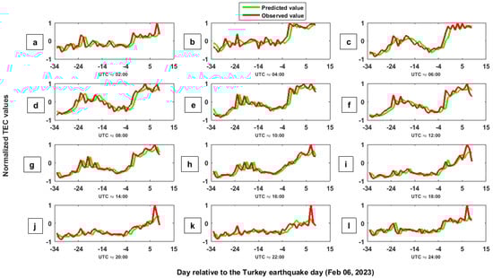 Panels (a–l) represent the time series of the predicted TEC values (green curve) when implementing the ANN method and also the normalized observed TEC values (red curve) during the test data at a different UTC. The x-axis indicates the day relative to the Turkey earthquake (6 February 2023) day.
