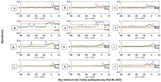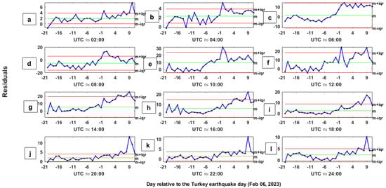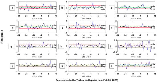 Panels (a–l) represent the time series of the error values obtained via differences between estimated and observed TEC values when applying the ANN method during the test data at a different UTC. The x-axis indicates the day relative to the Turkey earthquake (6 February 2023) day. The horizontal red lines represent the lower and upper bounds (). The horizontal green line shows the median value (m).