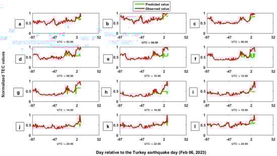 Panels (a–l) represent the time series of the predicted TEC values (green curve) when implementing the LSTM method and also the normalized observed TEC values (red curve) during the test data at a different UTC. The x-axis indicates the day relative to the Turkey earthquake (6 February 2023) day.