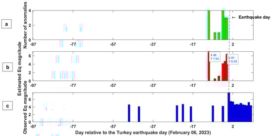 (a) Variation in the number of detected anomalies using different methods (green bars), (b) variation in the predicted earthquake magnitude (red bars), and (c) variation in the registered earthquake magnitude (blue bars) for the Turkey earthquake (6 February 2023) from 1 November 2022 to 17 February 2023. In all panels, the x-axis represents the day relative to the earthquake day indicated as a vertical dotted line.