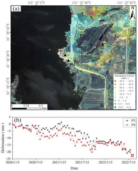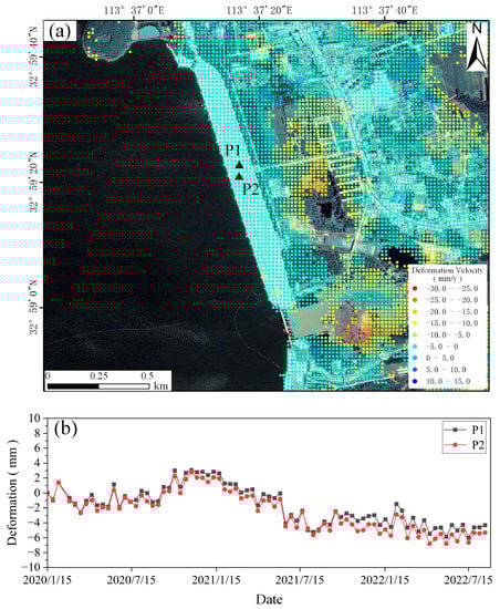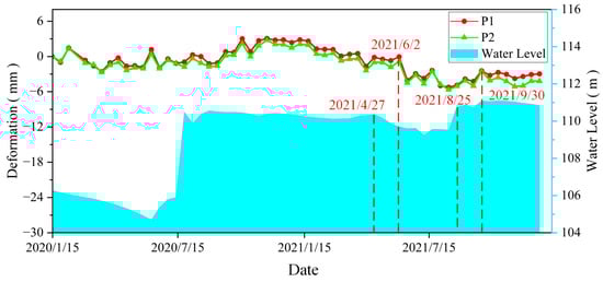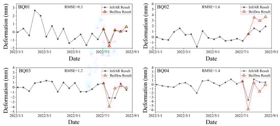 - There is good agreement between the InSAR monitoring results and the BeiDou ground-based deformation measurement data. The average root mean square error at the four common points is 1.1 mm, which demonstrates that the InSAR monitoring results are relatively reliable.