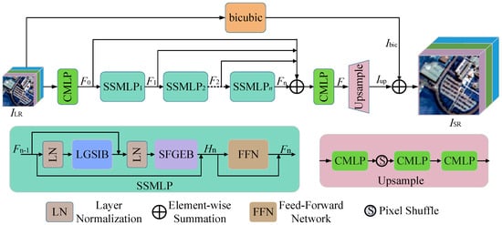 where LGSIBn, SFGEBn, and FFNn represent the blocks in the n-th SSMLP module and Fn−1 represents the output of the previous SSMLP block. Then, we fuse the outputs of all SSMLP blocks, and obtain the output F. Finally, the super-resolution image ISR is reconstructed, and the super-resolution process can be expressed as follows: