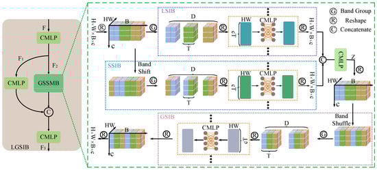 As shown in Figure 2, there are three blocks in the GSSMB: the local spectral integration block (LSIB), shift spectral integration block (SSIB), and global spectral integration block (GSIB). The LSIB and SSIB aim to extract two kinds of local spectral features and complement each other. The GSIB aims to extract the global spectral features. In addition, there are three kinds of parameter-free operations in GSSMB, including the band group, band shift, and band shuffle operations. They are used to split the feature maps, shift the bands, and rearrange the bands. The combination of CMLP and parameter-free operations can improve feature extraction. Three blocks and operations will be introduced one-by-one.