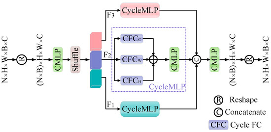 The details about the Cycle FC shall be provided. Mathematically, the denotes an input. As shown in Figure 3, the channel FC extracts spatial features on the same position along the channel dimension; however, the Cycle FC can capture the relationship among patches on neighbor channels. The definition of the Cycle FC can be described as follows:
